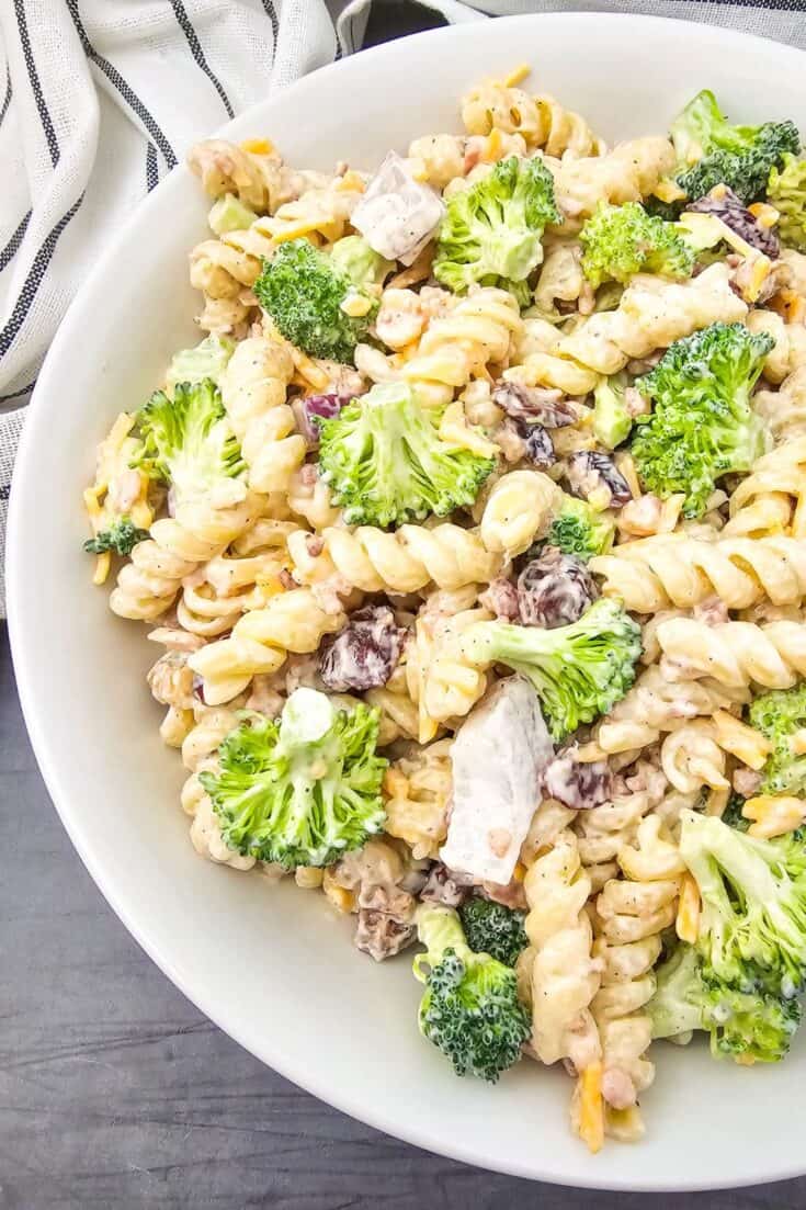 Large white bowl filled with cold creamy broccoli pasta salad, made with rotini pasta, broccoli florets, shredded cheddar, bacon bits, dried cranberries, and chunks of chicken, all coated in a thick, peppery dressing.